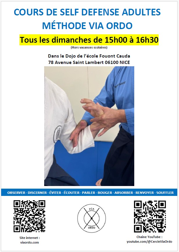 Nous donnons des cours collectifs de Self-défense (méthode VIA ORDO) tous les dimanches de 15h00 à 16h30 dans ce nouveau Dojo.